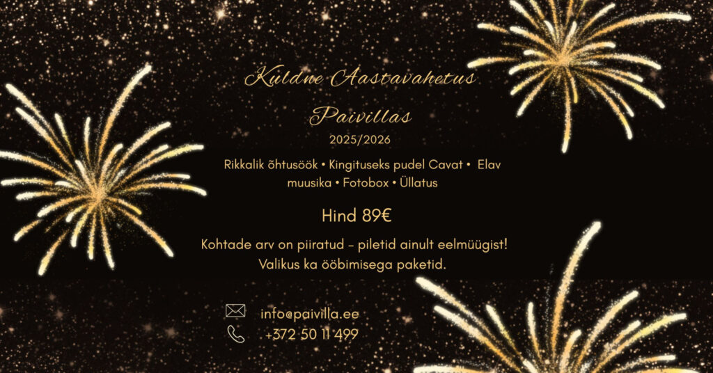 Aastavahetus 2025/2026 on suurepärane võimalus teha midagi enamat kui lihtsalt kodus televiisori ees šampanjat juua. Eestis toimub 31. detsembri ööl kümneid pidusid, galaõhtuid, kontserte ja spaapakette – nii Tallinnas, Tartus kui ka teistes linnades.